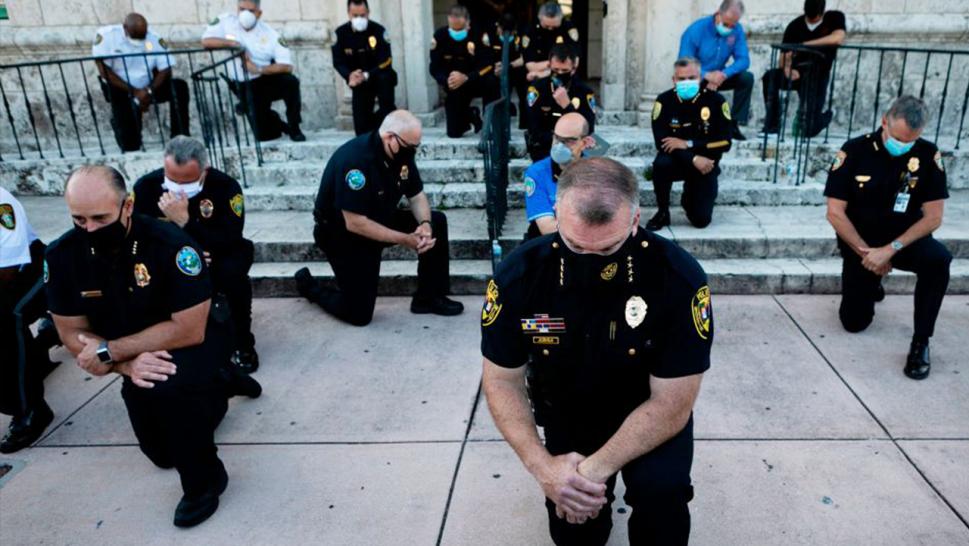 Police in Coral Gables, Florida, kneel in solidarity with the protesters against the killing of George Floyd. (Getty)