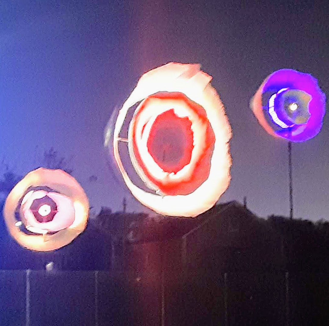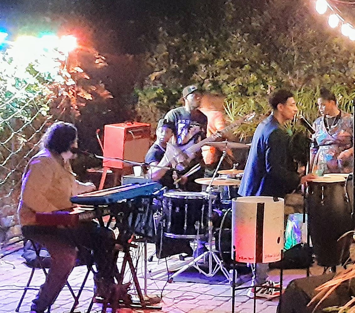 My favorite light installation hung from a sprawling oak tree and involved some intentional spotlighting of “deconstructed disco balls” which cast spiral shadows and random sparklies. Later, singer and songwriter Abigal Cosio pointed out that people have been dancing to mirrored balls long before disco. In addition to being right on that one, she was also the reason we were there. She fronts the band Bon Bon Vivant who did an evening outdoor concert under the cheery lights.